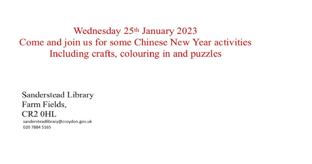 On Chinese New Year, Wednesday 25th January, Sanderstead Library invite you to join them for New Year activities including crafts, colouring in and puzzles. The library is open from 10am to 6pm.
