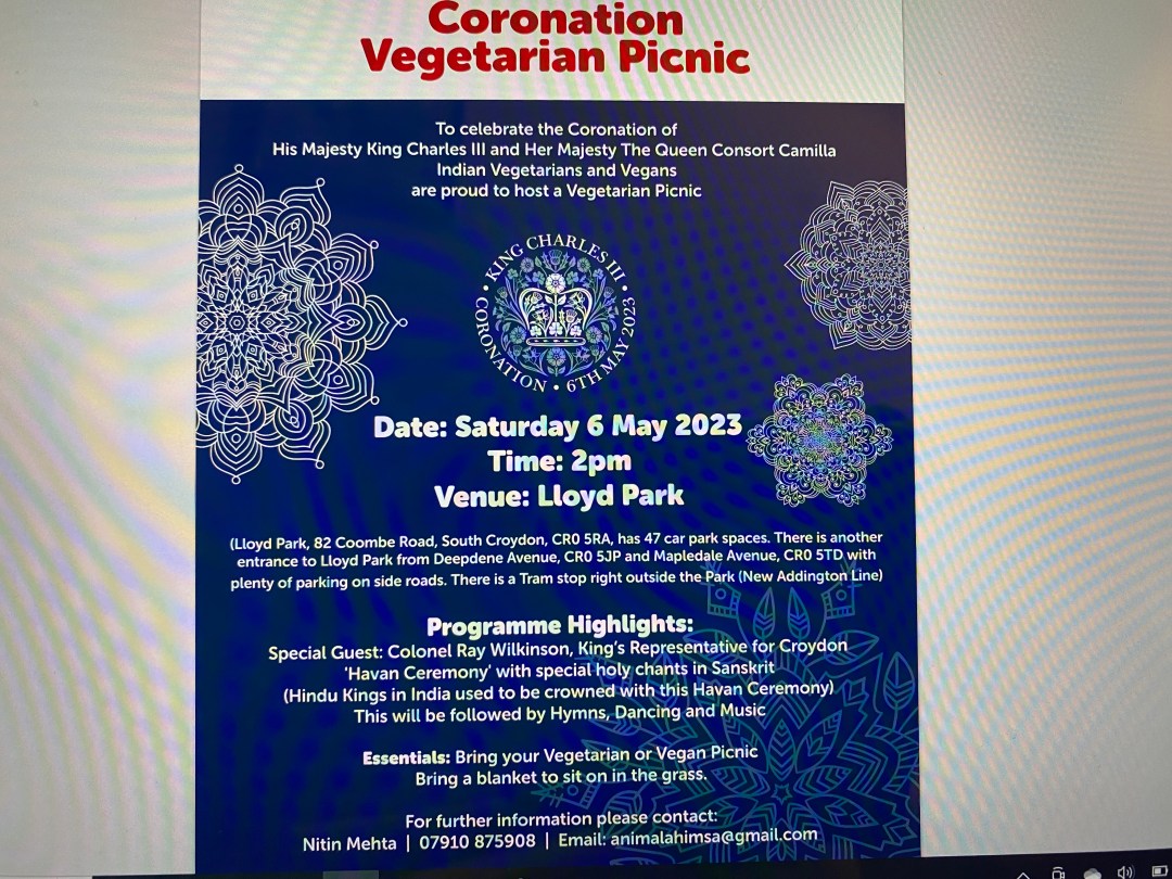 Hosted by Croydon Indian Vegetarians and Vegans at Lloyd Park on Saturday 6th May from 2pm. Click to access coronation-vegetarian-picnic.pdf Share this: Click to share on X (Opens in new window) X Click to share on Facebook (Opens in new window) Facebook Like Loading... Related
