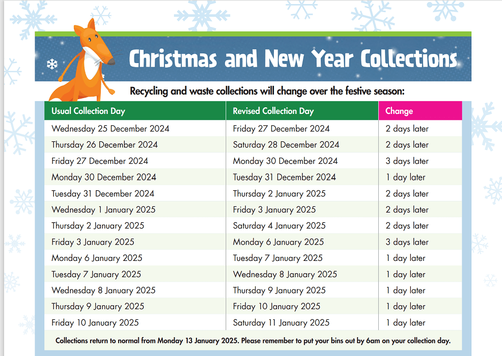 Please see the information below from the Council regarding bin collection dates over the festive period and tips on recycling.
