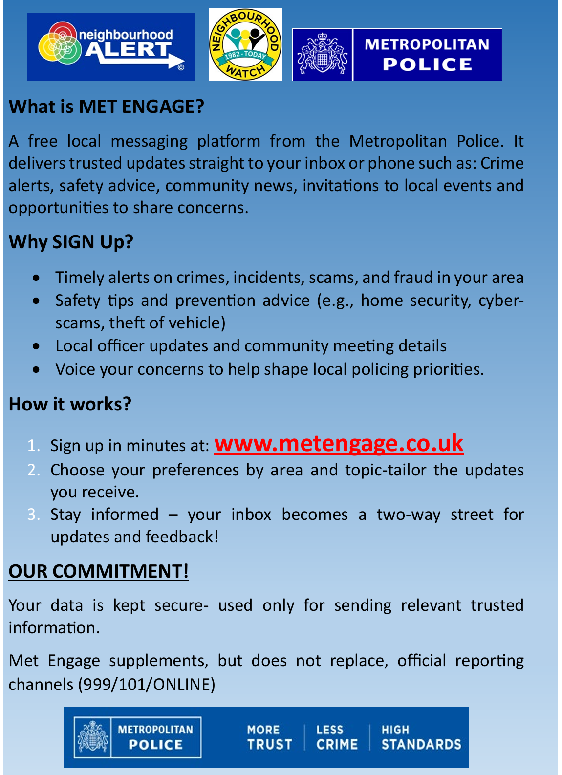 We’re encouraging all local residents to sign up to Met Engage, the Metropolitan Police’s new community engagement platform. It’s a great way to stay informed about local policing updates, events, and safety advice directly from your local team.