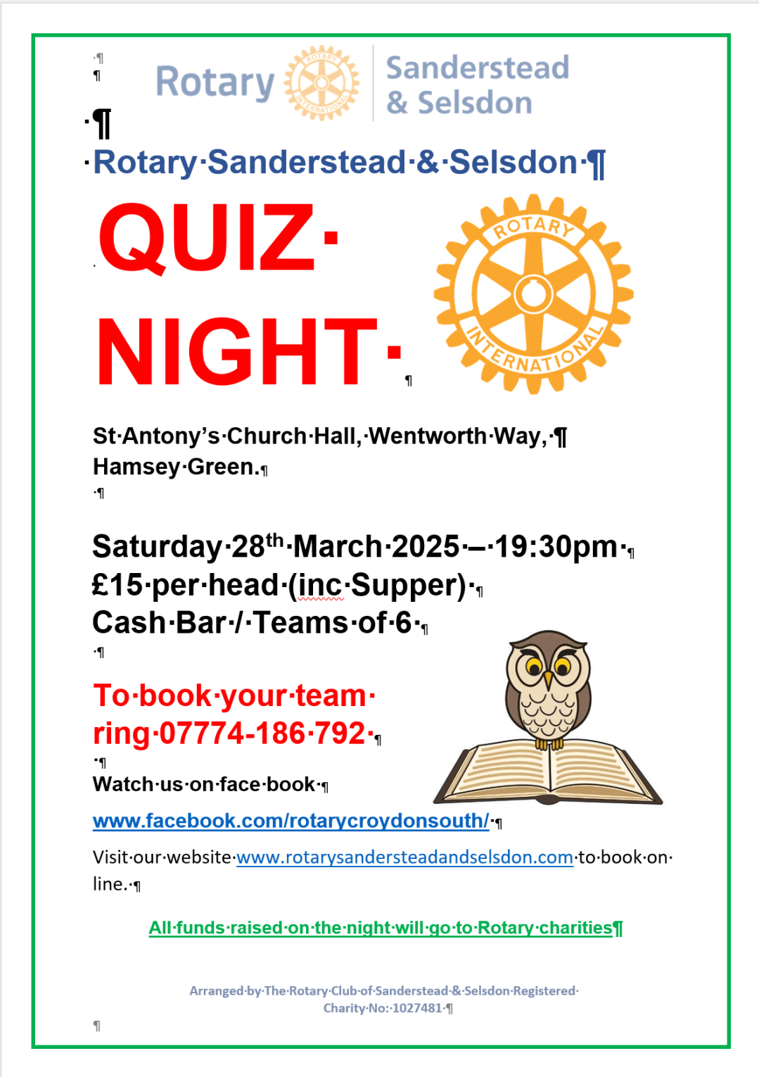 Rotary Sanderstead and Selsdon are holding their annual quiz on 28th March at 7.30pm at St Antony’s Church, Wentworth Way, Hamsey Green.