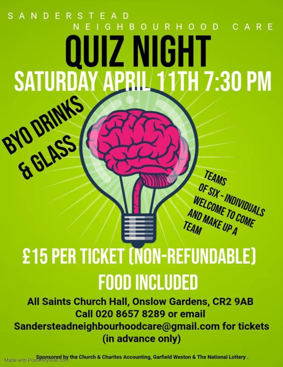 Sanderstead Neighbourhood Care are holding a quiz night on Saturday 26th April.