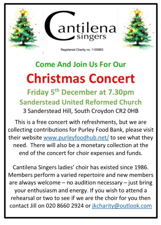 Cantilena Singers Christmas Concert – Friday 5th December 7.30pm, United Reformed Church, Sanderstead Hill