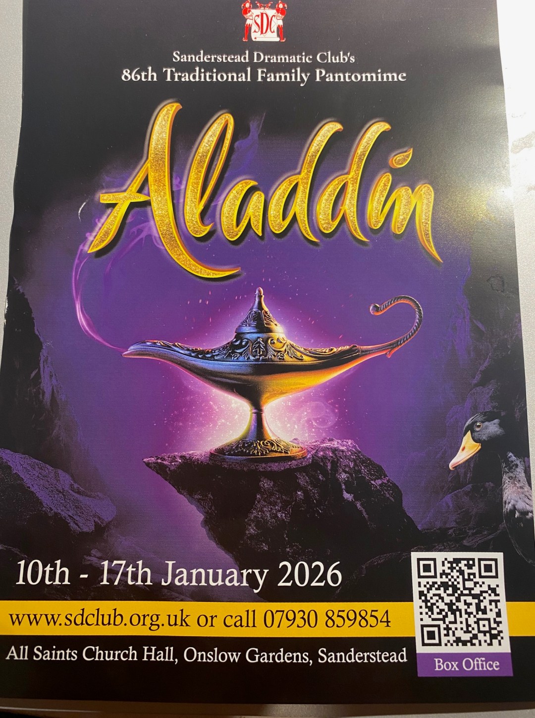 Aladdin is the 86th Traditional Family Pantomine by Sanderstead Dramatic Club. 10th-17th January 2026 All Saints Church Hall, Onslow Gardens Saturday 10th and Sunday 11th January 2pm and 6pm Tuesday 13th to Friday 16th January 7.30pm Saturday 17th January 2pm and 6pm Tickets from £8-11. https://www.sdclub.org.uk/ http://www.sdclub.org.uk or call 07930 859854 The evil Abanazar and … Continue reading Aladdin – Sanderstead Dramatic Club – January 2026