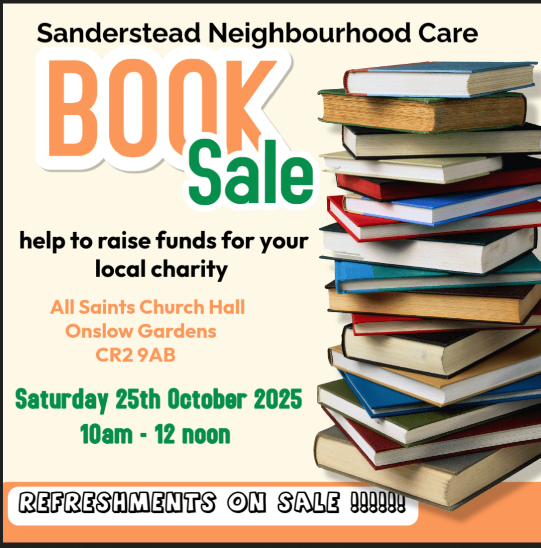 Sanderstead Neighbourhood Care who do so much good work for our community, are having a book sale to raise funds on Saturday 25th October, 10am to 12 noon at All Saints' Church hall.